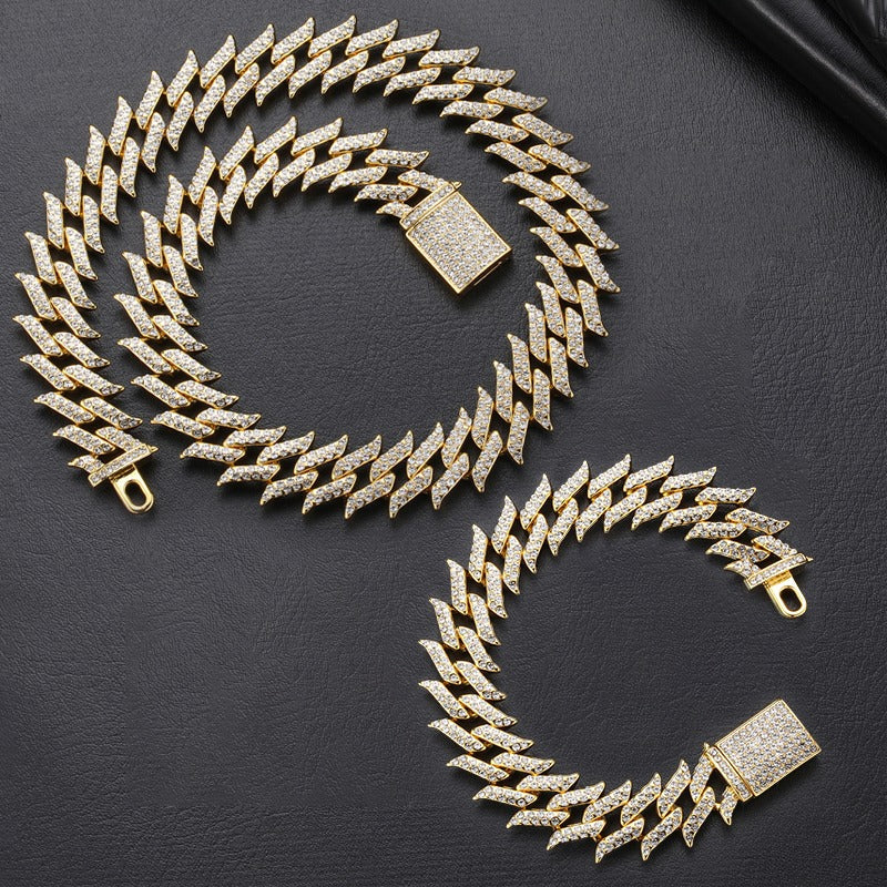 O Kit Cuban Flame (Ice Cravejado) 18mm traz um ar moderno ao clássico design da corrente Cuban. Este conjunto inclui uma corrente e uma pulseira, ambas cravejadas à mão com pedras de zircônia cúbica de qualidade AAA+, e com uma espessura robusta de 18mm.